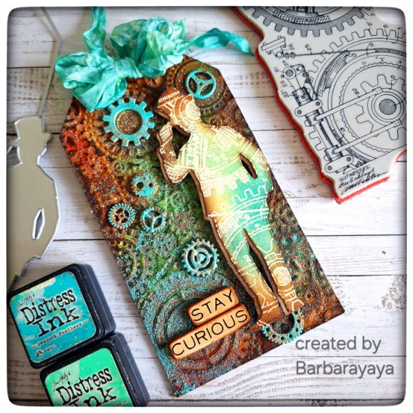 Barbara created a tag using the Simon Says Stamp Luggage Tags die. For the background, she used Tim Holtz’s Sizzix Vault Gears ML Embossing Folder. She added texture with two embossing powders: Ranger Ink Hammered and Wow Sea of Tranquility by Seth Apter.