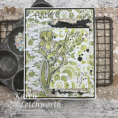 #4 Karen Letchworth – Kath loves Karen’s tone on tone Mother’s Day card in shades of green, a beautiful floral image on a stencilled background, decorated with lace and perfect black splatters.