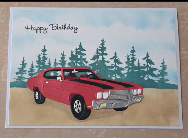 #7 Shirley Galecki Meihsia says, This is such a fun and awesome card! Love the fantastic die cut muscle car. The trees and sky on the background are so beautiful. Great design!