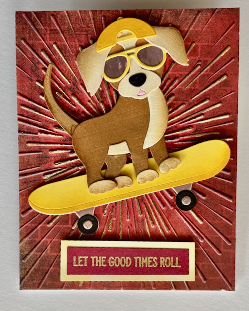 #21 Maureen Morton – Anna-Karin says: This is such a vibrant and fun card! The dog riding the skateboard is fantastic and I really like the colors and textures. And the sentiment! The star burst backgrounds fits perfectly with the energy of the card.
