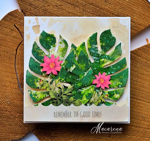 Macarena can’t wait some warmer days so she’s made a very summer card using Simon Says Stamp Monstera Wafer die as a focal point and covered the leaves with several layers of green shades of Tim Holtz Distress St. Patrick’s Mica Stain Bundle.