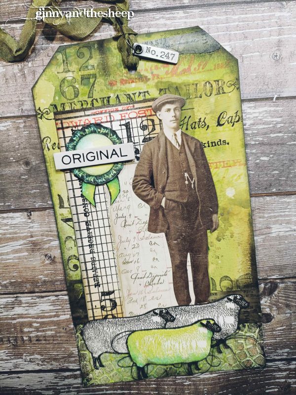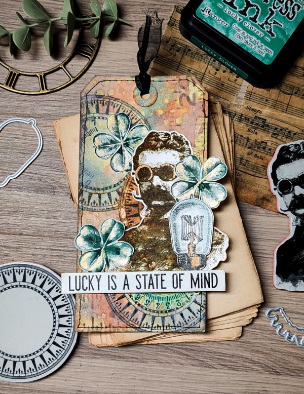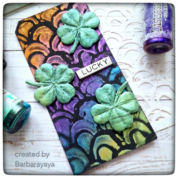 Simona made a Tag inspired by green Ireland, using Tim Holtz rubber stamps ‘Dapper’ and ‘On the Farm’, Tim Holtz Layering Stencil ‘Mosaic’ , Distress Grit Paste Opaque , Distress Oxide ink Twisted Citron, Distress Oxide Spray Mowed Lawn and Distress Spray Stain Rustic Wilderness