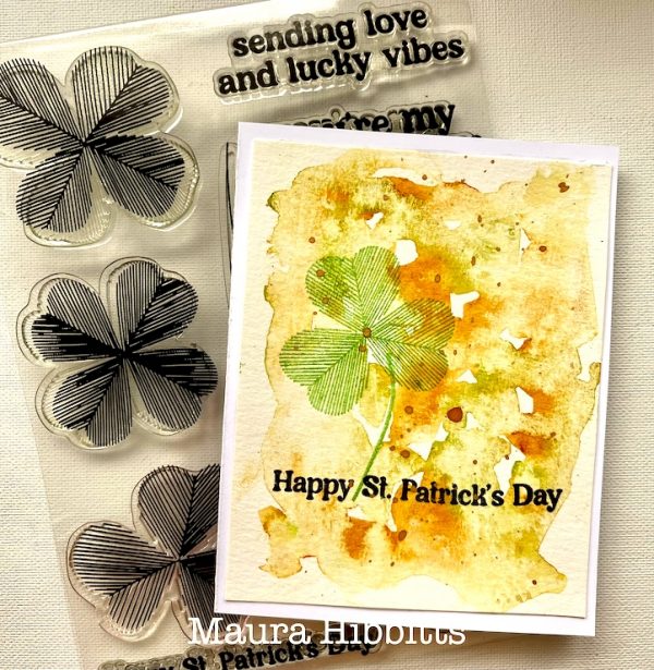 Maura took the opportuity this week to make some St. Patrick’s Day cards for one of her favorite holidays. She used the Simon Says Stamp Sketched Clover stamps, for her focal image and text, then Canson Watercolor paper, Daniel Smith watercolors, and watercolor brushes to create her background.