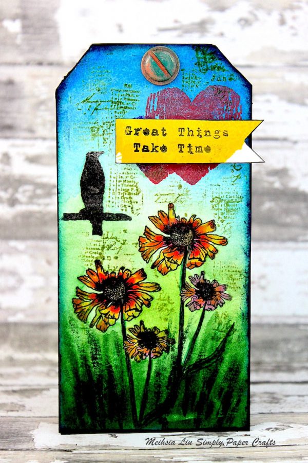 Meihsia was inspired to create a tag using Tracy Evans Boutique Designs Background Elements A7 Clear Stamps te11 and Tracy Evans Boutique Designs Create Your Own Story A5 Clear Stamps on the background, and decorated it with Tim Holtz idea-ology MACHINERY HEADS.