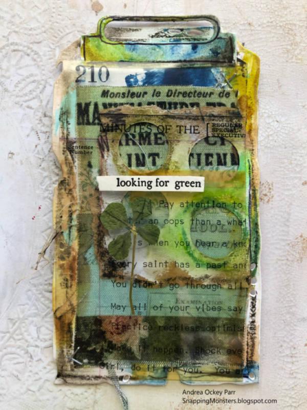 Andrea made a lucky clover tag using two die sets from Elizabeth Crafts: Bloom File Folder for the tag shape and Floral Slots File Folder for the tab at the top. She also incorporated Tim Holtz’s Multi Collage Eclectic Elements Palette fabric and used a 3/4″ EK Success circle punch to add some circular cut-out’s.