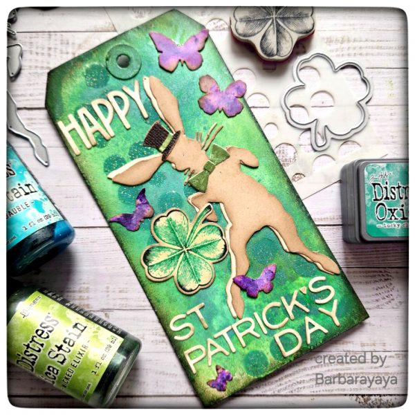 Barbara created two different tags, both inspired by St. Patrick’s Day. She used various stamps and stencils by Tim Holtz Stampers Anonymous: Brush Arch and mini set 59, Tim Holtz Curiosity Shop Stamps with Simon Says Stamp Dies Bundle. For coloring, she used several Ranger Ink Distress Spritz and Mica stains. The bunny in the center is from the Sizzix Vault Hippity Hop Thinlits Dies 666562.
