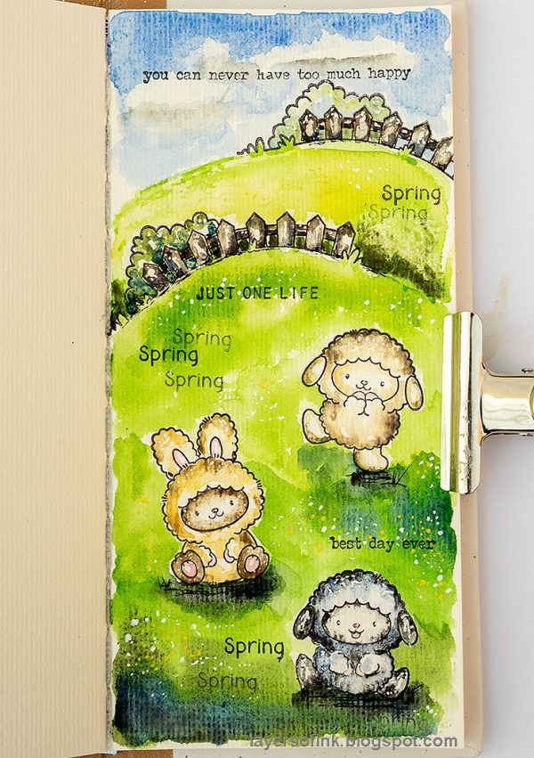 Anna-Karin made an art journal page using lots of bright spring green watercolor paint. The cute scene was stamped with Simon Says Stamp Hoppy Spring, from the new Beautiful Moments release. The page was done in Stamperia’s Happiness Mixed Media Journal 4×8.5.