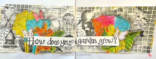 Maura has been thinking of Spring, especially since it has been a long, snowy winter. She created a background of images and tied them together with the Simon Says Stamp Grid stencil. Since she went with a black and white background, she added bright flowers and ferns with Tracy Evans Beauty Surrounds Us stamps and Simple Stories Vintage Woodlands stamps..