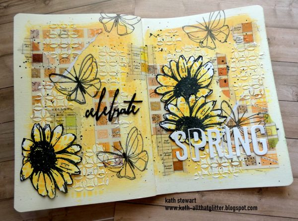Kath created a page in her Stamperia Stone Paper Mixed Media Journal to celebrate the arrival of Spring using Tim Holtz/Idea-ology Yellow Palette Collection paper, Simon Says Stamp Petal Lattice Stencil, images from Simon Says Stamp A Little Artsy stamp set, Simon Says Stamp A Little Artsy Stencils and Masks and Tim Holtz/Sizzix Handwritten Celebrate and Alphanumeric Shadow Upper Thinlits.