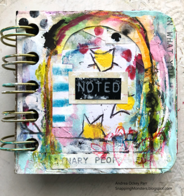 Andrea made a small art journal using scraps from Amy Tangerine’s Paper Play book and Dina Wakley’s Collage Sparks 1 and 3. She added patterns using Tim Holtz’s Mixed Media 2 and Seth Apter’s ESA35 stamp sets. She added color with Distress Crayons and watercolors.