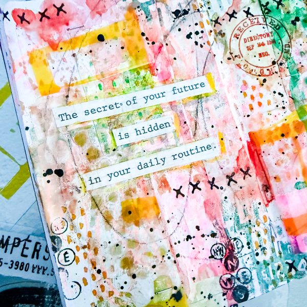 Cheiron created a page in her art journal using her palette of Distress Watercolor Pencil shavings as her first layer. She added stamps from the Tim Holtz Mini Media Marks and Tidbits sets. She added Dina Wakley Typed Ledgers quote and a Paint By Number stamp as the focal points on her page.