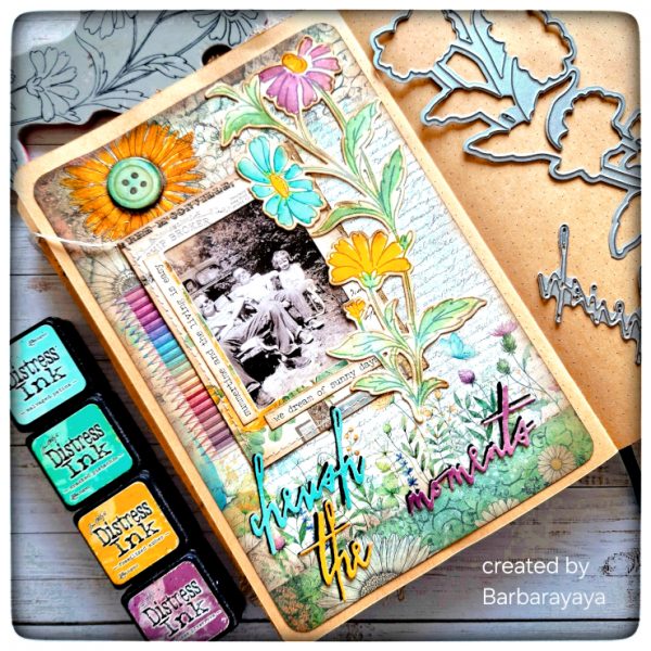 Barbara created a page for her Art Journal inspired by the sun and spring colors. For the background, she chose an 8 x 8 sheet from Stamperia Daisy Art pad. She used a stamp by Tim Holtz Stampers Anonymous, Embroidery CMS486, matched with a Simon Says Stamp Wafer Dies. She chose Ranger Ink Distress Ink Pad Mini to color her page. In the center, a photo from Idea-ology Snapshots Volume 2.