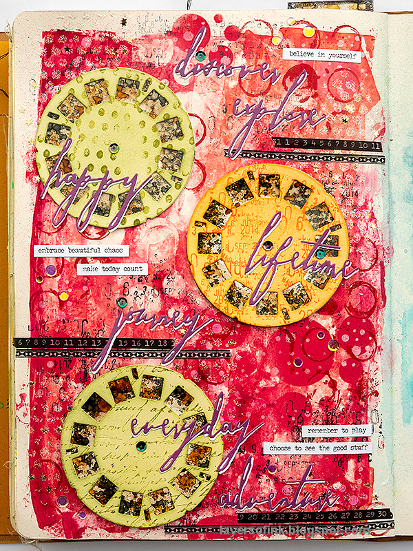Anna-Karin made an art journal page with some wise words. The words were die cut with Tim Holtz Sizzix Handwritten Journey and Handwritten Celebrate. The picture wheels were die cut with Tim’s Vault Picture Show from Ranger Heavystock paper and Simon Says Stamp Acetate Sheets.