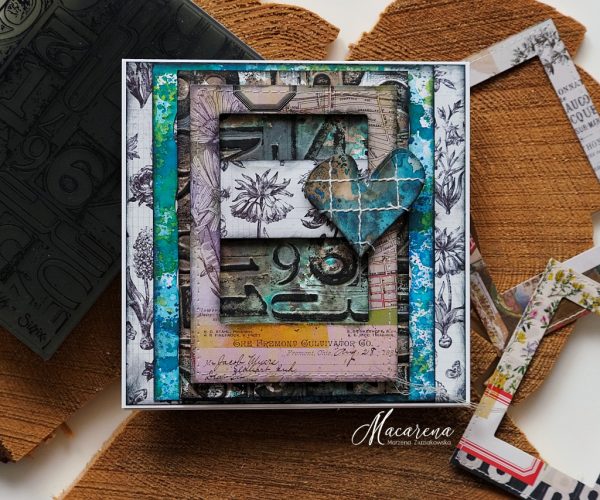 Macarena used Tim Holtz Sizzix Numbered 3D Texture Fades Embossing Folder and applied Tim Holtz Flip Top Black Soot Distress Paint to make the texture pop. The stitched heart is made with Tim Holtz Sizzix Lovestruck Colorize die.