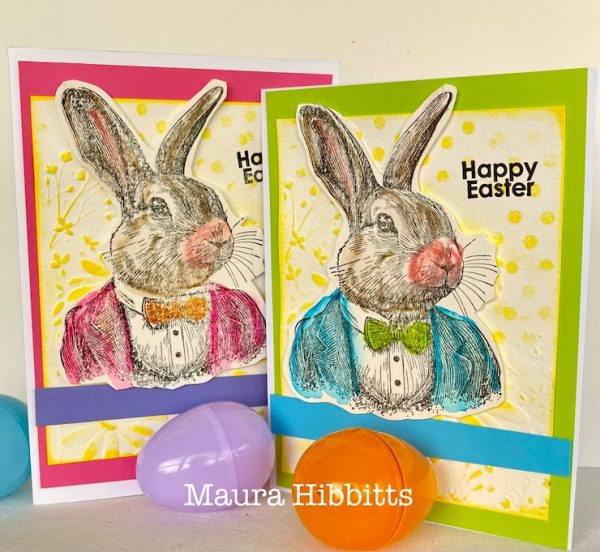 Maura made a fluffle of bunny cards using the Simon Says Stamp Fresh Daisies Embossing Folder, Tim Holtz’s Mr. Rabbit stamps, and Simon Says Stamp Hoppy Days Ahead stamps.