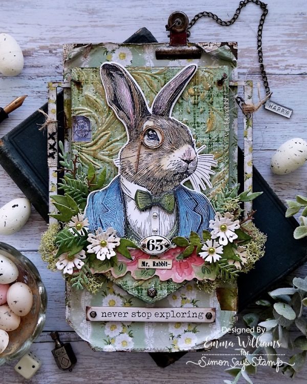 Emma used the Sizzix Botanical 3D Embossing Folder by Tim Holtz to create the background on a Stampers Anonymous Etcetera Facade, which is layered onto a Mini Etcetera Tag. For the focal point of her project she stamped, watercolored and then die cut Mr Rabbit using the Tim Holtz/Simon Says Stamp die and stamp bundle before adding die cut foliage and florals.
