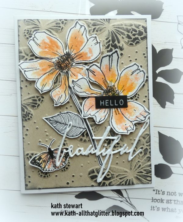 Kath used Simon Says Stamp Confetti Butterflies Embossing Folder to create the background, Sizzix Studio Wild Blooms Clear Stamp Set coloured with Tim Holtz/Ranger Distress Embossing Glazes, Tim Holtz/Sizzix Handwritten Love Thinlits and Idea-ology Sentiments Label Stickers for the sentiment.