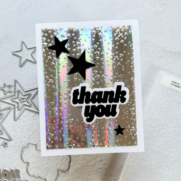 Cheiron created a sparkly Thank You card using Simon Says Stamp Assorted Holographic cardstock and the Shimmering Starfall Embossing Folder. She finshed her card with the CZ Design Thank You wafter die as a sentiment and added a few die cut stars from the Stars dies.