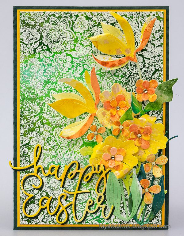 Anna-Karin made an Easter card with a white embossed background. The intricate background stamp is from Tim Holtz Rosette and Floret. The background was misted with Distress Spray Mists and Twisted Citron Distress Spritz. The sentiment is die cut with Simon Says Stamp Bouncy Happy Easter.
