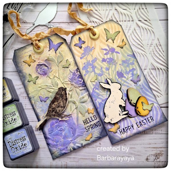 Simona made 2 Tags experimenting with various embossing techniques using Mini Distress Embossing ink, Ranger ‘Clear’ Embossing Powder, Distress Embossing Glaze Salvaged Patina, Tim Holtz Sizzix 3D Texture Fades Embossing folder ‘Numbered’ and 3D Impresslits cut and emboss folder ‘Winged’