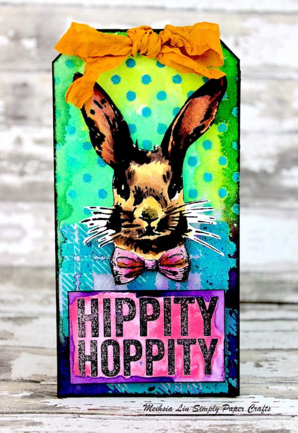 Meihsia was inspired to create a mixed media tag using Tim Holtz Clear Stamps and Stencil Hipster Bunny, Plaid and Polkadot on the background, then colored it with Zig Kuretake Gansai Tambi 24 COLOR Set and decorated it with May Arts White Wrinkled Faux Silk Ribbon with Cut.