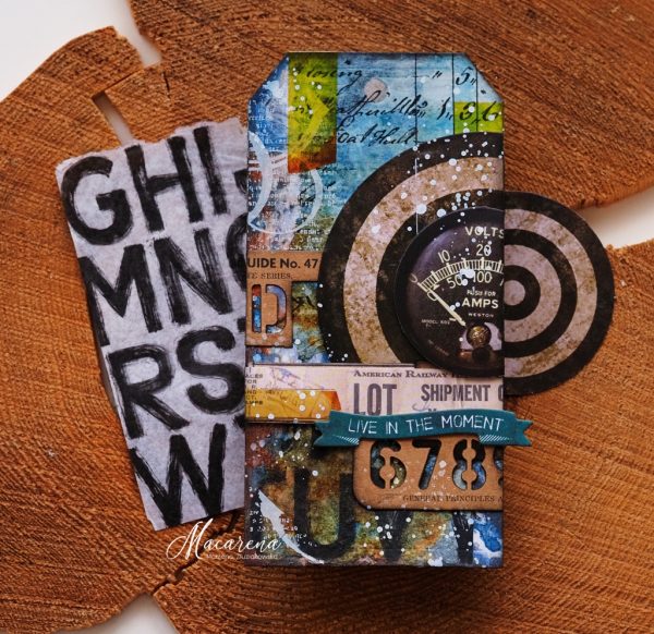 Macarena made an industrial tag using for the background Tim Holtz Idea-ology Collage Paper Archive glued with Tim Holtz Distress Collage Medium Matte. She made up the composition with Tim Holtz Idea-ology Paper Strips and Stencil Cards and Cello Sticker Tape.
