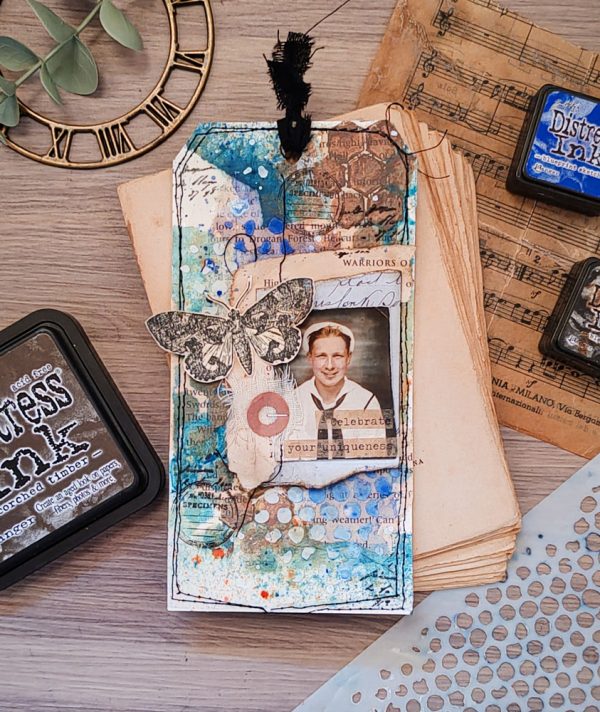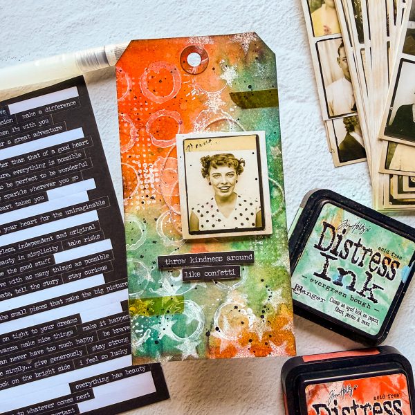 Cheiron created a tag using the Tim Holtz Halftone and Rings as her background to create a resist. She blended Evergreen Bough and Ripe Persimmon Distress Inks. She added a Photobooth Photo and a sentiment from the Small Talk Stickers.