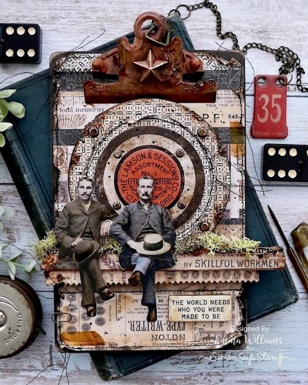 Emma altered an idea-ology Mini Clipboard using many of the amazing products from Tim Holtz. She covered the board with the Neutral 8 x 8 Paper Palette Collection before adding layers of detail including Paper Dolls, a Quote Chip Label and Etcetera Trims.