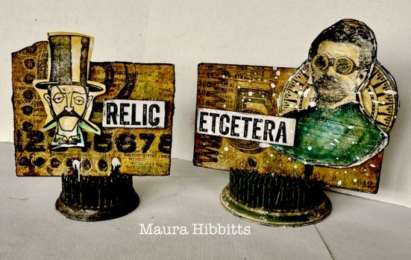 Maura made two memorydex/follodex cards using tim Holtz’s Inquisitive and the Professor stamps. She created a background with Tim Holtz Collage Papers Archives and distress paints like Tim’s Fossilized Amber.