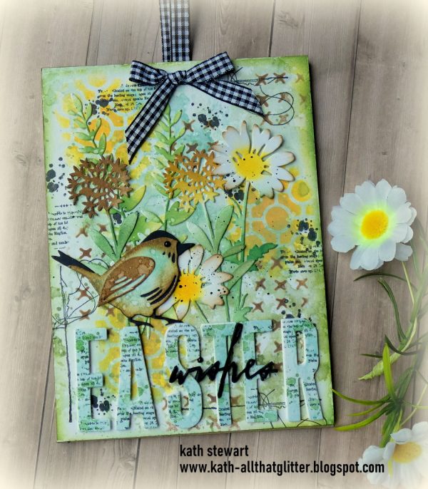 Kath created an Easter Wishes Wall Panel using Tim Holtz/Stampers Anonymous Etcetera Rectangles Panel, Linked Circles and Stitches Layering Stencils, Simon Says Stamp A Little Artsy stamp set, Tim Holtz/Sizzix Feathered Friends, Wildflower Stems 1, Alphanumeric Bulletin and Handwritten Celebrate Thinlits.