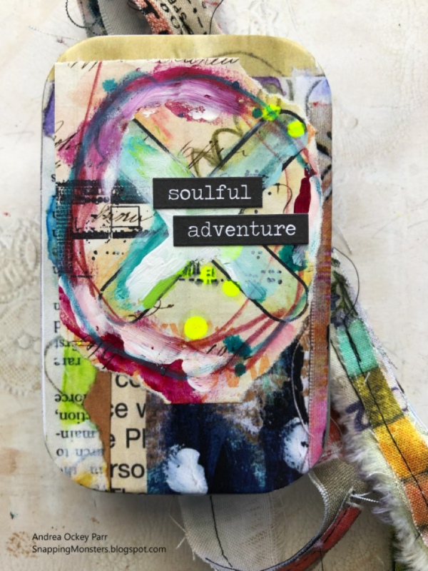 Andrea decorated a tin and made a fabric ribbon to tie around it. She used Tim’s Mini Glitch and Glitch 2 stamp sets for the images and sewed the ribbon using Tim’s Eclectic Elements Multi Collage fabric. She added drips of Tim’s Fluorescent Alcohol Ink and his Chitchat stickers to finish it off.