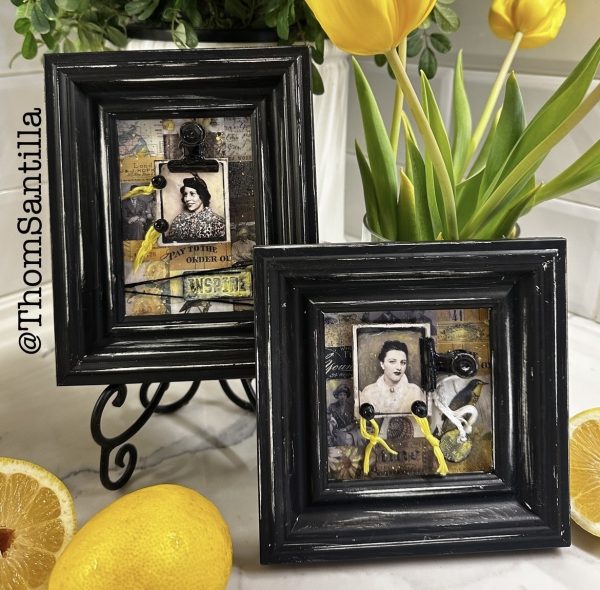 Thom recycled a couple of old frames and colored them with Antique Linen and Black Soot Distress Paint. He then used a sanding disc on the edges to show the lighter color. He painted Hitch Fasteners and Hinge Clips and coated with Glossy Accents. For the background he used Collage Strips, and added Photo Booth images and some extra hardware for the focus.