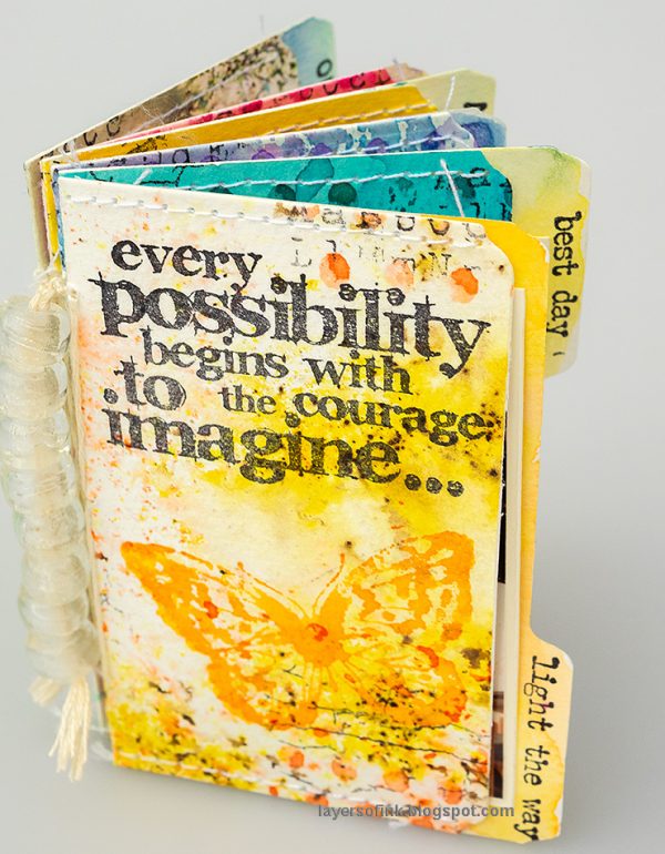 Anna-Karin made a mini book from file folders die cut with Tim Holtz Vault Noteworthy set. The book was stamped with various sentiment, texture and image stamps by Tim Holtz, such as the butterfly on the front which comes from the Flutter set. The dots were stamped with Tim’s Tiny Textures.