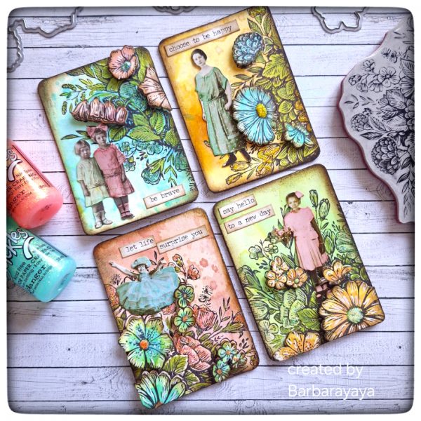 Barbara continues to be inspired by spring! Today, she created a series of ATCs using the Tim Holtz Stampers Anonymous Floristry CMS485 stamp paired with the Simon Says Stamp Floristry Wafer Dies sss485 . She colored the backgrounds with Ranger Ink Distress Spray Stain and some Stickles for sparkle. She cut the ATCs with the Sizzix Collector Thinlits Dies 665926.