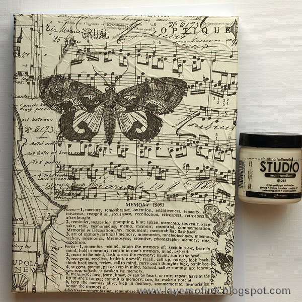 Tissue paper works great as a background, especially if you crumble it up a bit so that it forms interesting folds and lines. You can use white tissue paper, but I like to use Tim Holtz printed tissue wraps, since they also add great background patterns. Tear off a piece that is larger than your surface. Cover your surface with Claudine Hellmuth’s Multi-Medium Gloss (or Matte) and place the tissue paper on top. Pull and form the paper until you are happy with the texture. The multi-medium gives you enough working time to do this. Paint another layer of multi-medium on top of the tissue paper.