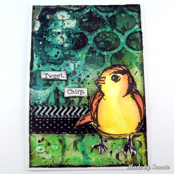 Maura created her own mini album full of bird quotes using lots of Dylusions paints like Fresh Lime, Vibrant Turquoise and Squeezed Orange, Dyan Reaveley’s Bird on a Wire stamp set, Dylusions Clearly Borders, and a gelli plate.