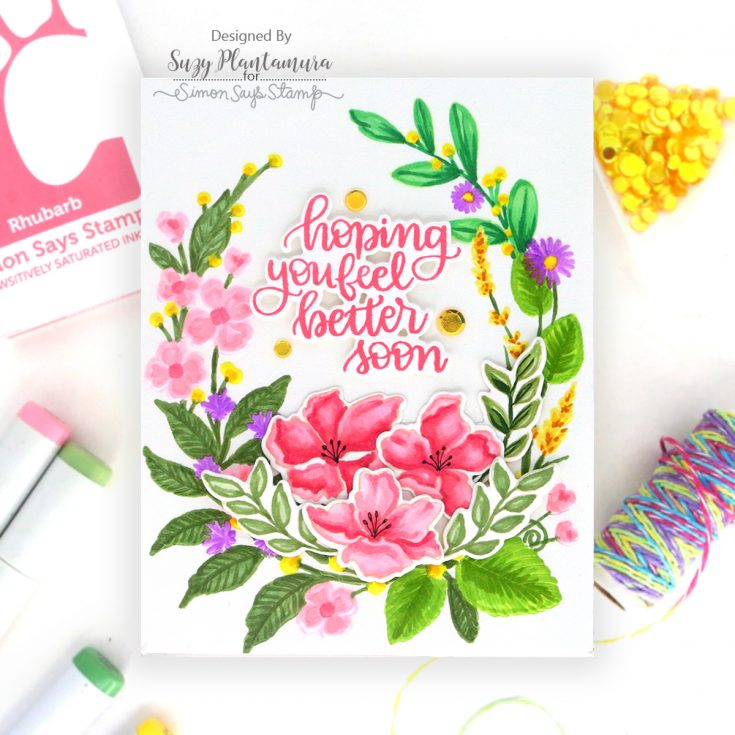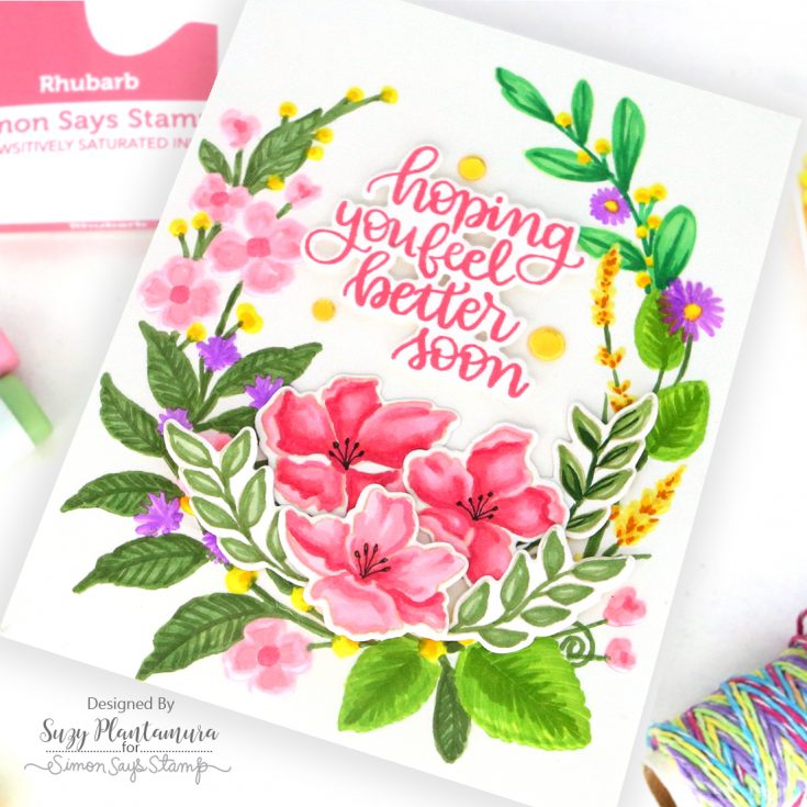 I attached the colored embossing folder to a white card base. I attached the flowers and leaves using foam tape beneath just the front flower and gluing the leaves only at the base so they kind of float. I stamped a sentiment from the Handlettered Encouragement Stamp set with Rhubarb PSInk and die-cut it out with the new matching dies. I attached it with foam tape behind it to the top of the card. I added three yellow sequins around the greeting.