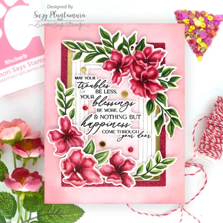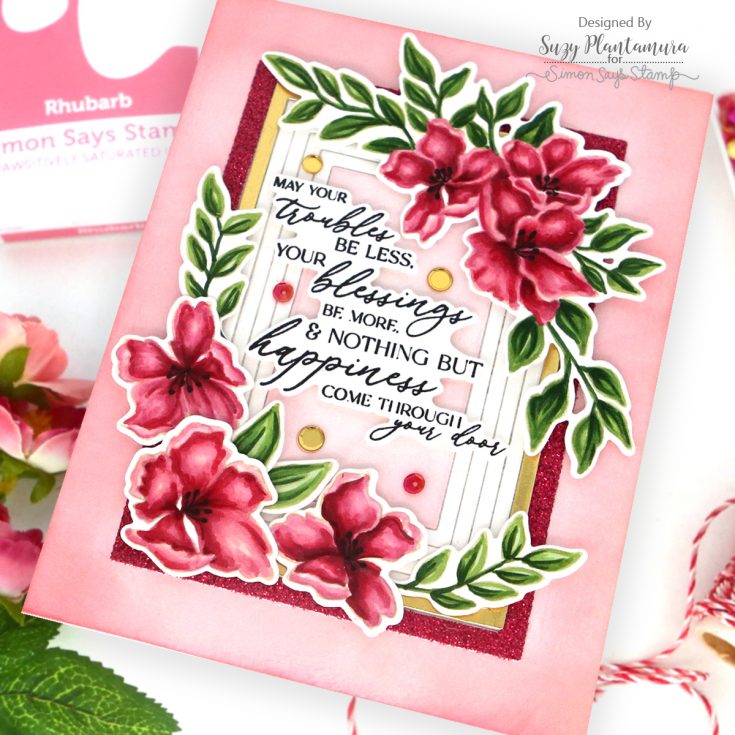 I made the background using the A2 Frame Dies. I didn’t cut mine apart allowing me to use both the frames and the in-betweens as frames which are the same size, so you get twice as many size frames with the set! I die-cut one from Flamingo Glitter Cardstock and one size smaller from Gold Matte Cardstock. I then cut all the ones that were smaller than that one from white cardstock. I applied some Rhubarb Ink on the which cardstock background as well as the inside piece of the frames. I attached them to the center of the background piece. I stamped a sentiment from the stamp set with Versafine Ink and die-cut it out. I attached all the flowers, leaves, and sentiments over the background using foam tape beneath all of them. I used the rose red and gold sequins from the Hot Tamale Embellishment Mix around the sentiment.