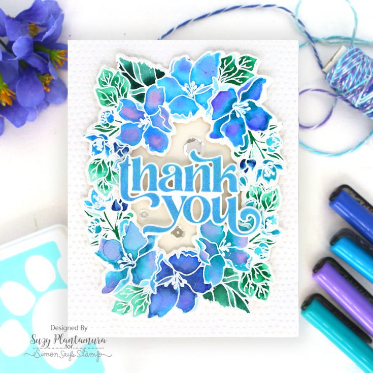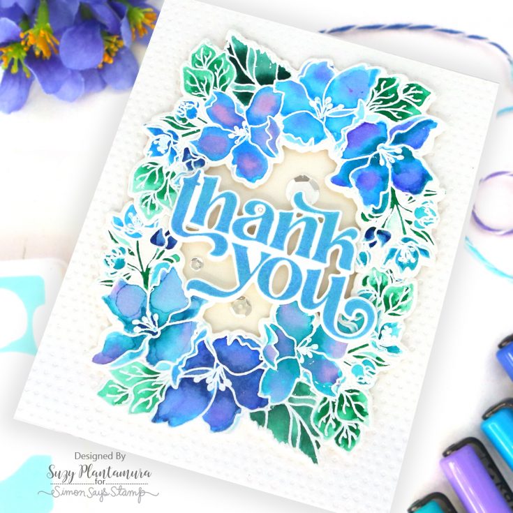 I embossed two of the rounded floral stamps with white embossing powder on Arches watercolor paper. I painted them with Karin Brushmarkers. I primarily used all the turquoise blues but then I added some pink and lavender inside the petals. I die-cut them out and attached them to the top and the bottom of the oval opening with foam tape beneath them. I stamped a sentiment from the With Thanks stamp set using Marine PSInk. I die-cut it out with the matching die and attached it to the middle of the card with foam tape behind it. I added three sparking clear sequins to the center around the sentiment.