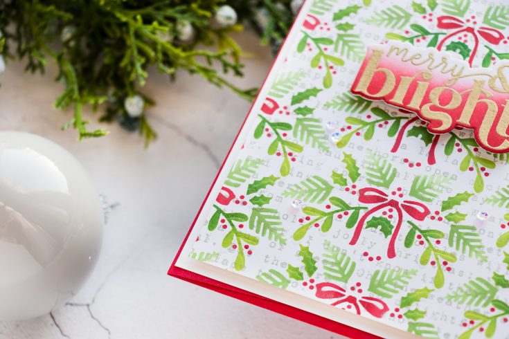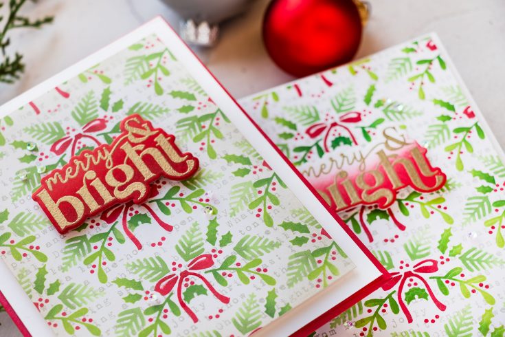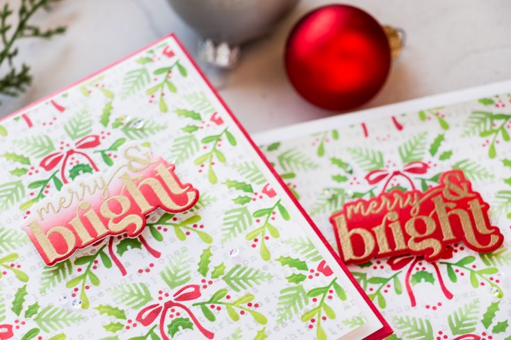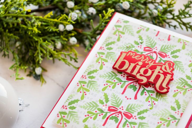 My sentiment comes from CZ Making Spirits Bright set. I heat embossed “Merry & Bright” in gold on red cardstock, added ink blending with Cranberry and Brick, and then die cut it with the coordinating die. For extra sturdiness, I adhered it to a second die-cut layer before foam-mounting it to my background.