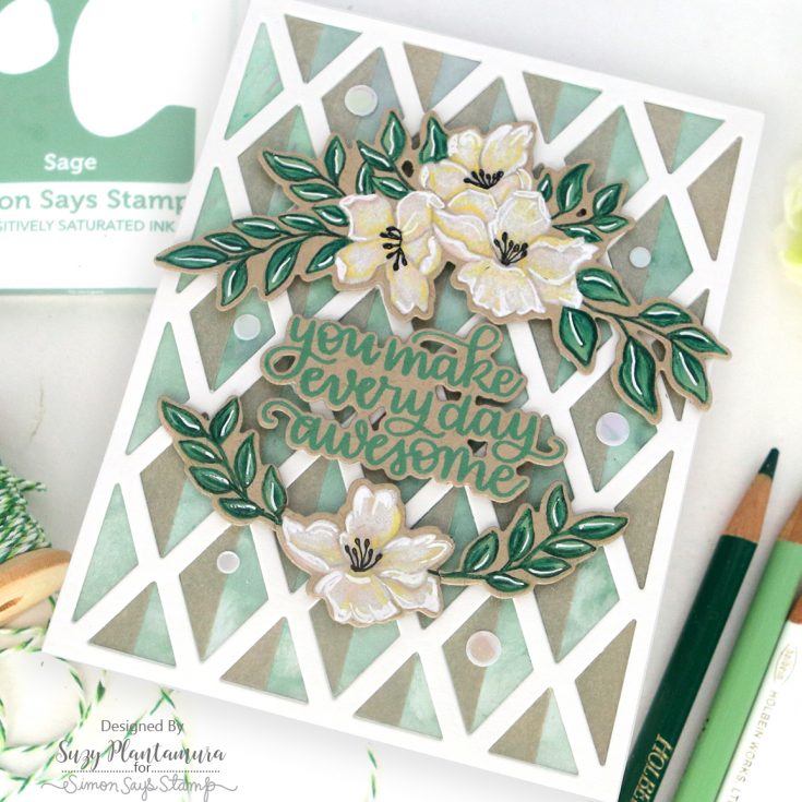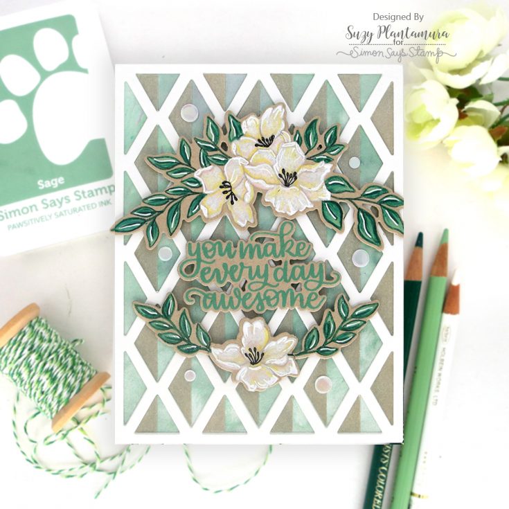 I die-cut two of the new Dual Diamonds Wafer Dies from White Cardstock. I die-cut another using Bronze Vellum which matches kraft cardstock perfectly. I glued one of the frames to a piece of watercolor paper I had painted with a sage watercolor. You could also use sage cardstock or blend sage ink over white cardstock. I then glued the bronze vellum inside pieces to half of the spots leaving the green showing in the others. I glued a second white frame over the first one so it had more depth and covered any messes I made glueing the vellum pieces in. I attached the two floral groupings with foam tape beneath them to the front. I stamped a sentiment from the Handlettered Encouragement stamp set with Tidepool PSInk on kraft cardstock. I die-cut it out and attached it between the flowers. I added a few white sequins around the card front.