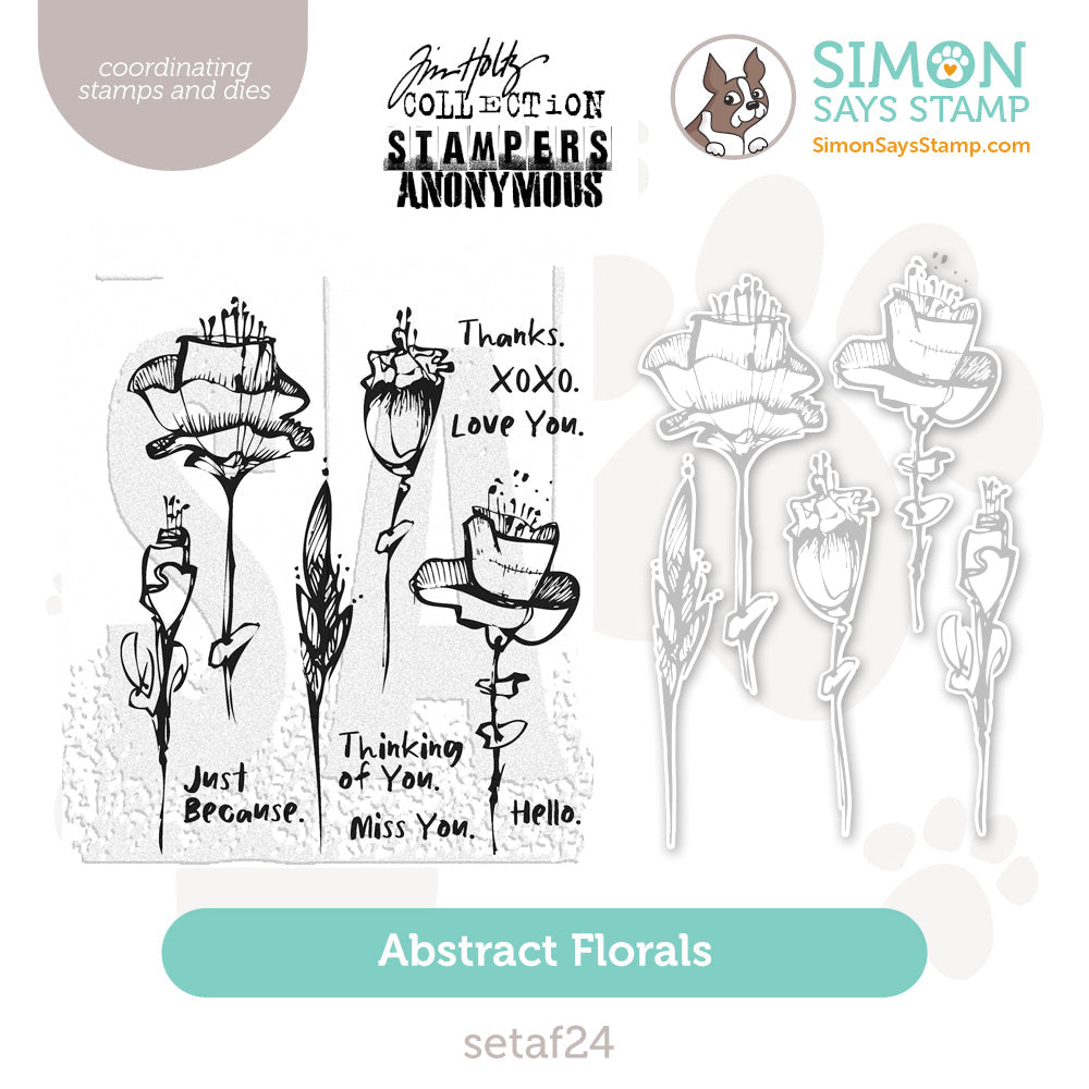 These bold and vibrant tags feature the new Abstract Florals stamps—as well as the coordinating dies that are exclusively available at Simon Says Stamp! I also used the Cutout Shapes 2 stencil, some Sparkle Texture Paste, and a bunch of Tim Holtz Distress Inks! There are also some accents that I created with the new Vault Picture Show die set from Tim Holtz and our Simon Reverse Just Groovy sentiment strip set.