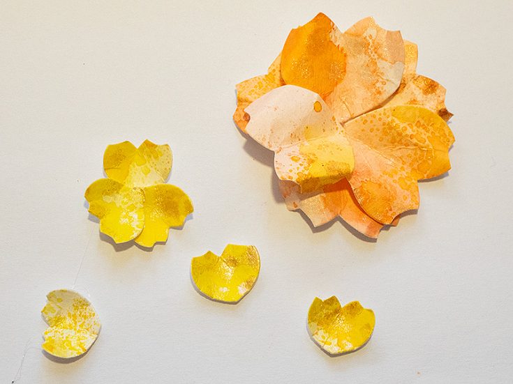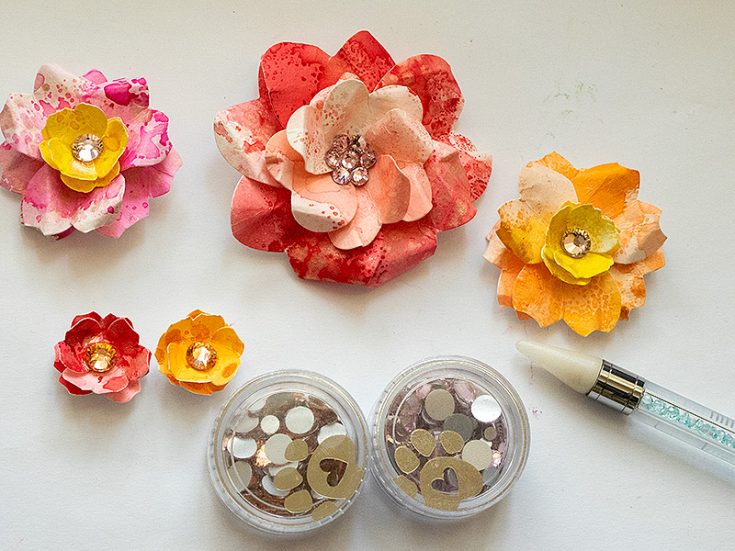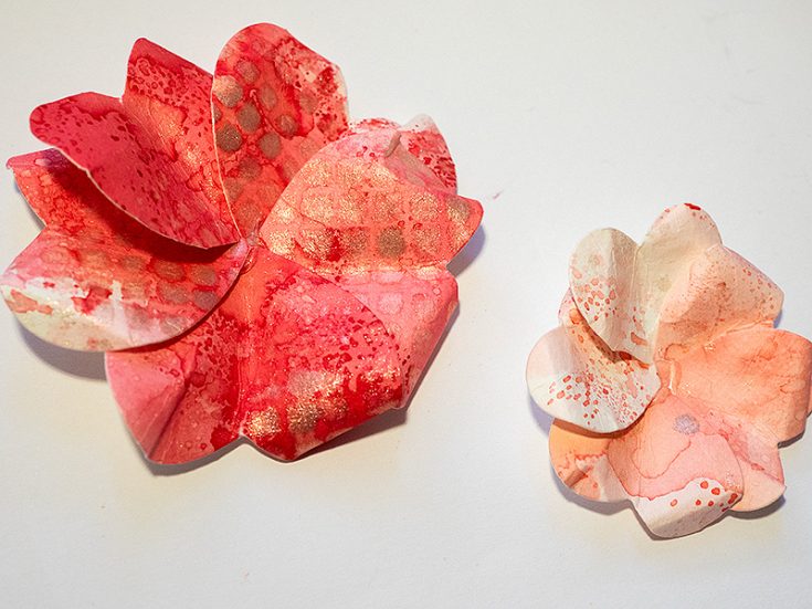 Use Tim Holtz Shaping Kit to add shape to the flowers. Fold, roll and pinch the petals/hearts. They start looking less like hearts and more like petals.