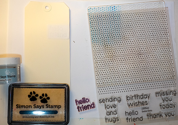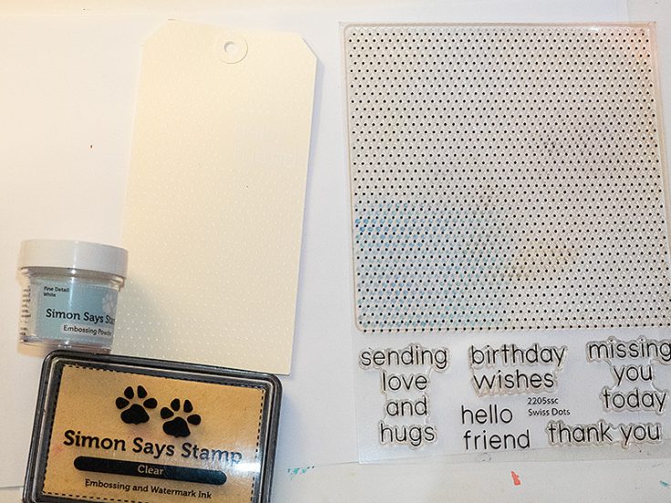 The background is embossed resist. Start by white embossing the sentiment from Simon Says Stamp Swiss Dots and repeat on Simon Says Stamp Masking Paper. Cut the masking paper into a rectangle and adhere over the stamped sentiment.