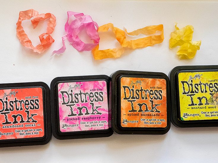 I dyed May Arts White Wrinkled Faux Silk Ribbon with some of the Distress Inks used for the flowers.