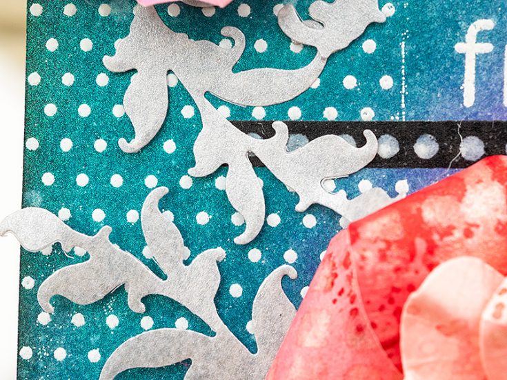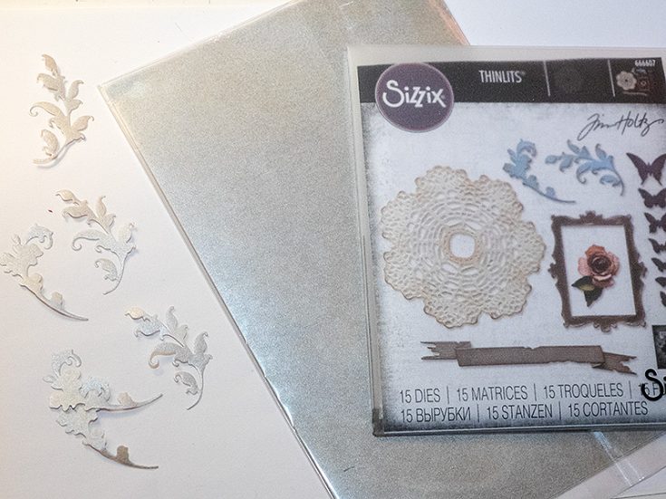 Finally, I die cut flourishes with Tim Holtz Vault Boutique set from Simon Says Stamp Silver Vellum paper.