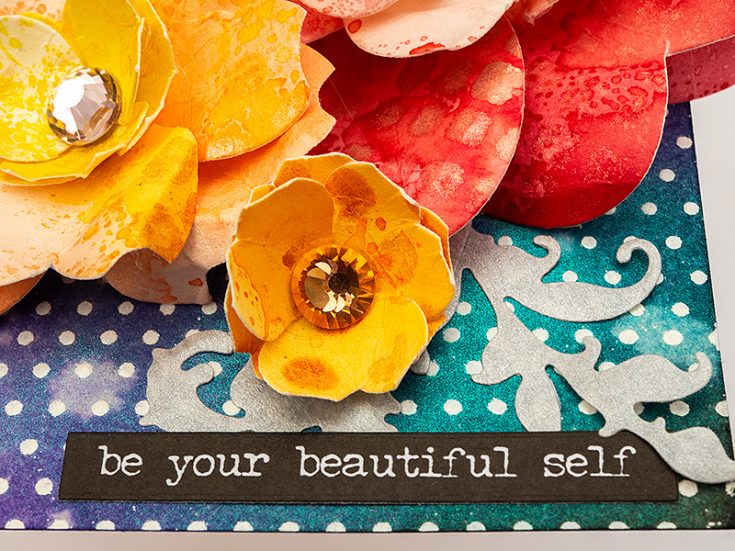 Tuck the flourishes in here and there. As you can see here, the flowers have quite a bit of dimension. If you use the larger flower dies, you can make really big flowers. For another way of using the Simon Says Stamp Rounded Hearts die, check out my Fun with Shrink Sheets tutorial.
