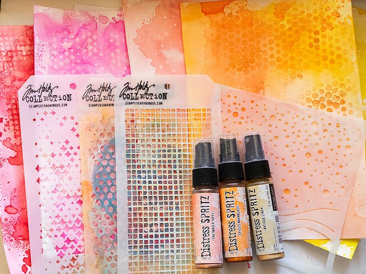 For subtle patterns and shimmer, I misted through various stencils with Distress Spritz Saltwater Taffy, Spiced Marmalade and Antique Linen.