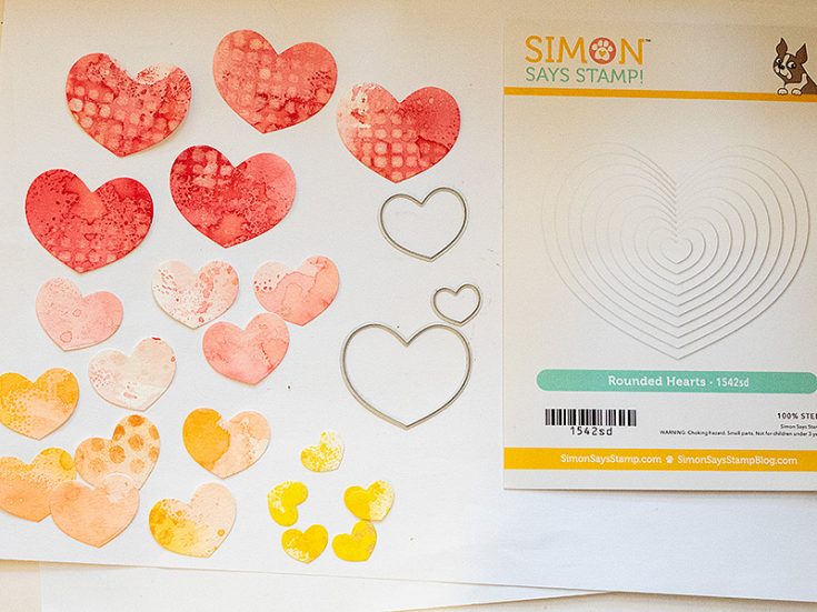 I enjoy thinking of different ways to use dies and here I combined that with another favorite, namely, to make dimensional flowers. The flowers were made with the Simon Says Stamp Rounded Hearts set. Since the set comes with ten heart dies, you can make these flowers in many sizes. Let’s start.