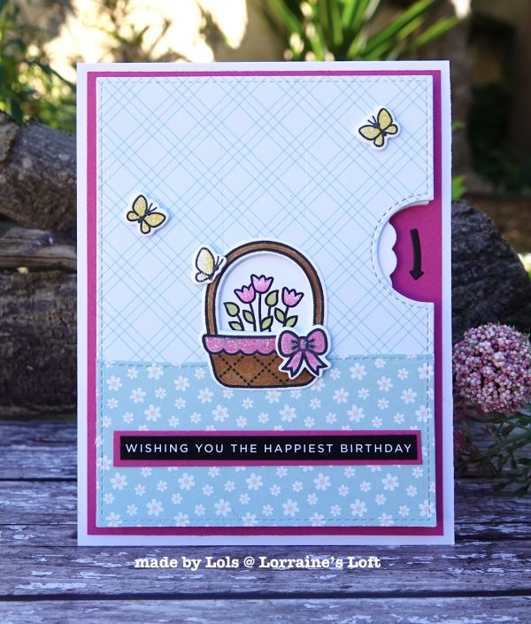 Lols used a Lawn Fawn Spring Basket Stamp, Dies and Stencil Set a Reveal Wheel Die Set, a Reveal Wheel Spring Basket Drop Down Template and Die Set and a Bitsy Blooms Paper Pack